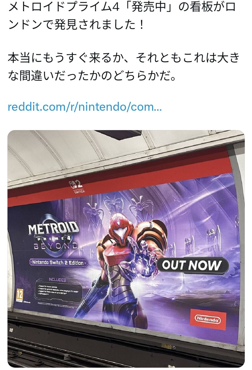 | 『メトロイドプライム4 ビヨンド』がすでに発売中?ロンドン地下鉄で広告が発見される …流用して『メトロイドプライム4』の広告を作成し、発売中表記を取り忘れたのではないか」という説を唱えています。 また、『メトロイドプライム4 ビヨンド… (出典:) |