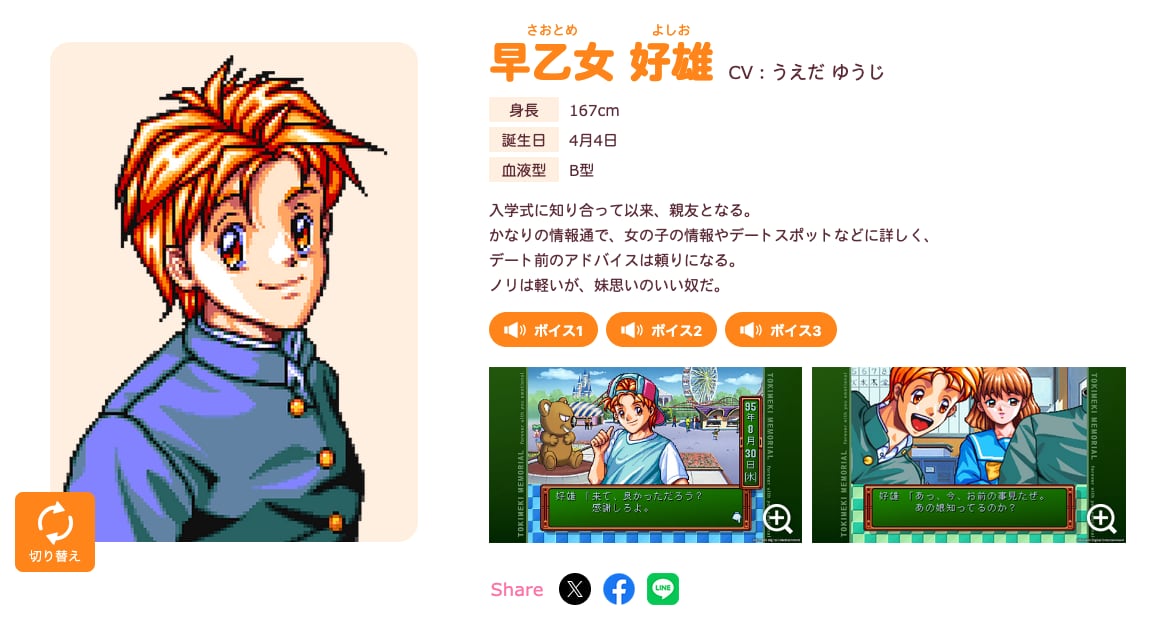 好雄くんは、主人公(プレイヤー)と入学式に知り合って以来の親友。かなりの情報通で、女の子の情報やデートスポットなどに詳しく、デート前のアドバイスは頼りになる。ノリは軽いが、妹思いのいい奴だ(公式サイト『Characters』より)。
