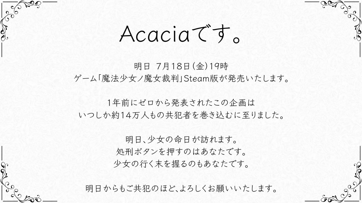| 黒幕の"魔女"は誰?発売前から異例の人気!新作ADV『魔法少女ノ魔女裁判』朗読劇の夜公演レポート …、Steam向け新作アドベンチャーゲーム『魔法少女ノ魔女裁判』初の朗読劇&トークイベント「魔法少女ノ魔女裁判~the first page~」が、5月… (出典:Game Spark) |