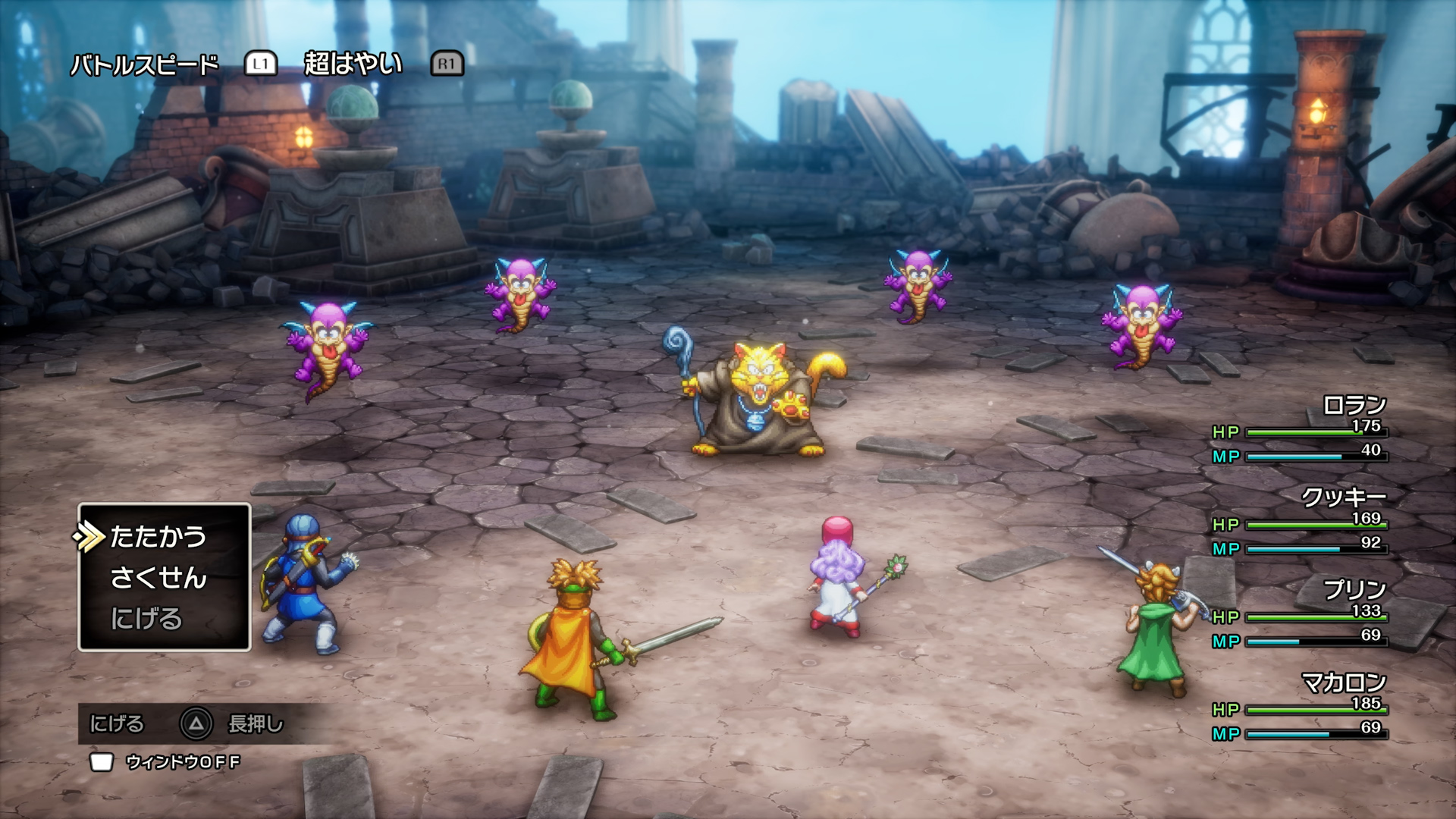 ついにボス戦! 原作ではグレムリン✕4との戦闘だったが、今作ではネコノマンサーという新たなボスも一緒に登場(見た目はねこまどうの色違い)。ネコノマンサーが使う攻撃呪文の中で危険なのがザキとザラキ。