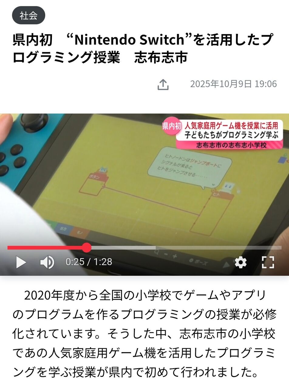 | | 県内初 “Nintendo Switch”を活用したプログラミング授業 志布志市 志布志市の志布志小学校で行われたプログラミングの授業。子どもたちが手にしているのは人気家庭用ゲーム機、Nintendo Switchです。もちろん子どもたちの… (出典:1:29) |