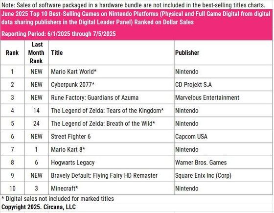 ・同作はデビュー週に12位にランクインしたが、『マリオカート ワールド』、『Pokemon Legends: Z-A』、『ドンキーコング バナンザ』、『マリオカート8 デラックス』といった作品の後塵を拝した