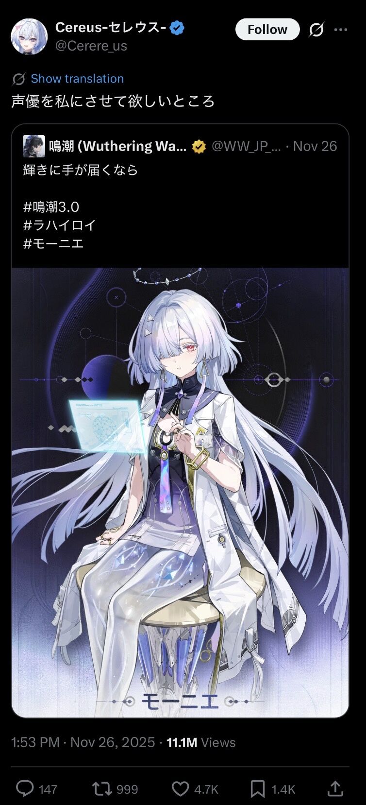 | 『鳴潮』Ver.3.0新キャラ「モーニエ」の情報が公開!頭脳明晰だけど口下手、そして透明な太ももをした女の子 …KURO GAMESは、オープンワールドARPG『鳴潮』にて、新キャラクター「モーニエ」の情報を公開しました。 ◆Ver.3.0新キャラ「モーニエ」… (出典:インサイド) |