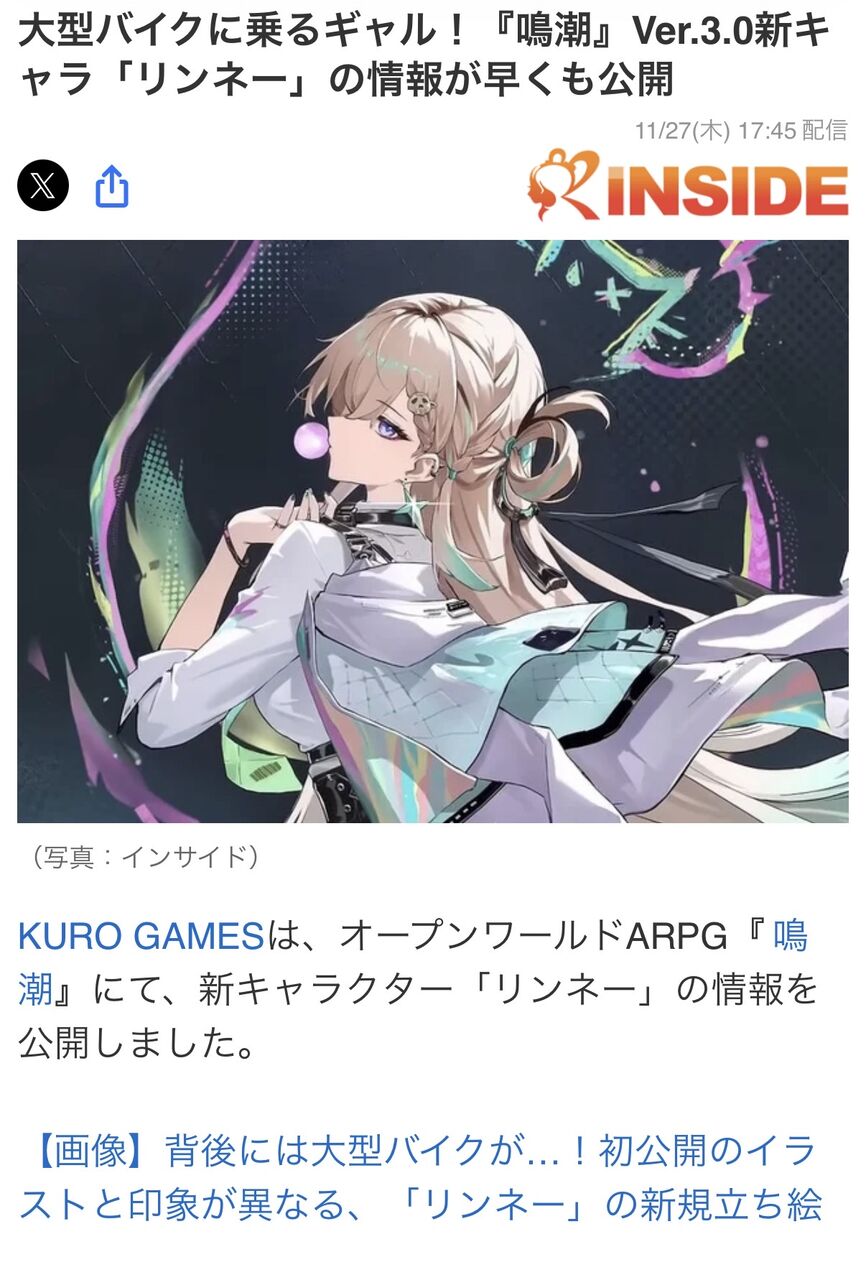 | 大型バイクに乗るギャル!『鳴潮』Ver.3.0新キャラ「リンネー」の情報が早くも公開 …ARPG『鳴潮』にて、新キャラクター「リンネー」の情報を公開しました。 ◆ラハイロイ新キャラクター「リンネー」の情報が早くも公開! 『鳴潮』では11月… (出典:インサイド) |