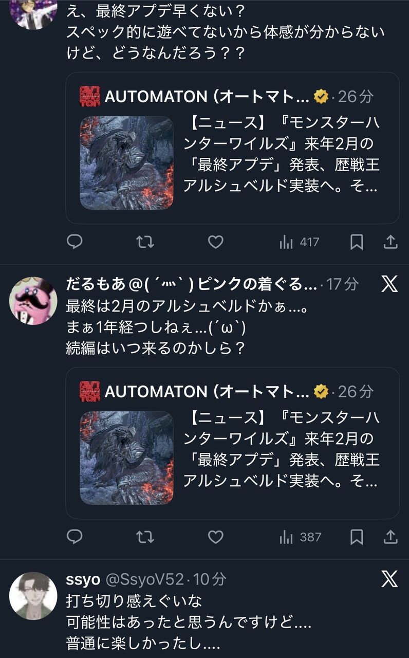 | 『モンスターハンターワイルズ』来年2月の「最終アプデ」発表、歴戦王アルシュベルド実装へ。そこまでにSteam版最適化アプデも3段階で実施予定 - AUTOMATON 『モンスターハンターワイルズ』来年2月の「最終アプデ」発表、歴戦王アルシュベルド実装へ。そこまでにSteam版最適化アプデも3段階で実施予定 AUTOMATON (出典:AUTOMATON) |