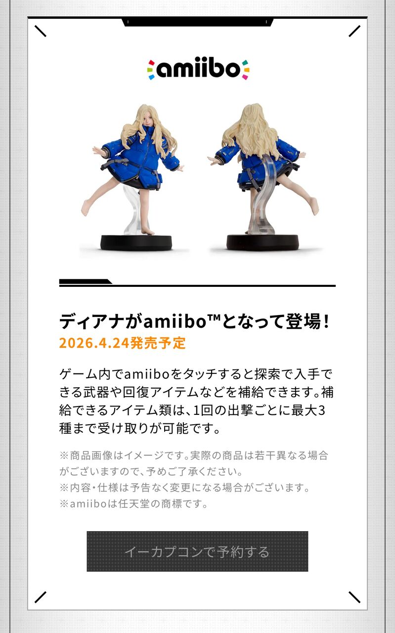 | こだわりを捨ててでも快適度を優先する。カプコン完全新作「プラグマタ」インタビュー …に戻ると消失しますが、再度出撃してamiiboを読み込むと、またアイテムを獲得できます。 ――ディアナのamiiboはかなり可愛らしいポーズですが、こ… (出典:GAME Watch) |