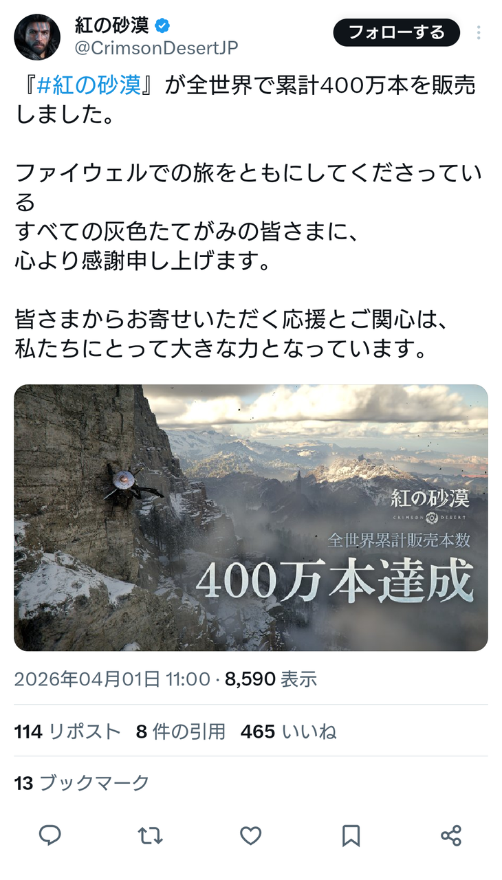 | 『紅の砂漠』全世界累計400万本突破、発売から10日ほどしか経っていないのに。相次ぐアップデートでユーザーの不満をつぎつぎ解消中 …)の新作タイトル『紅の砂漠』が、2026年3月20日の発売からわずか10日で全世界累計販売本数400万本を突破した。 『紅の砂漠』は、“ファイウェル… (出典:ファミ通.com) |
